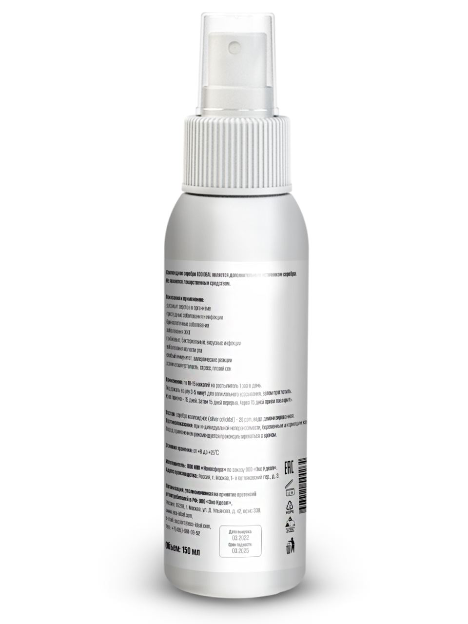 Представляет собой взвесь мельчайших заряженных частиц серебра в деионизированной воде (концентрация 20 ppm). Без цвета, вкуса и запаха. Безвреден, серебро не накапливается в организме.