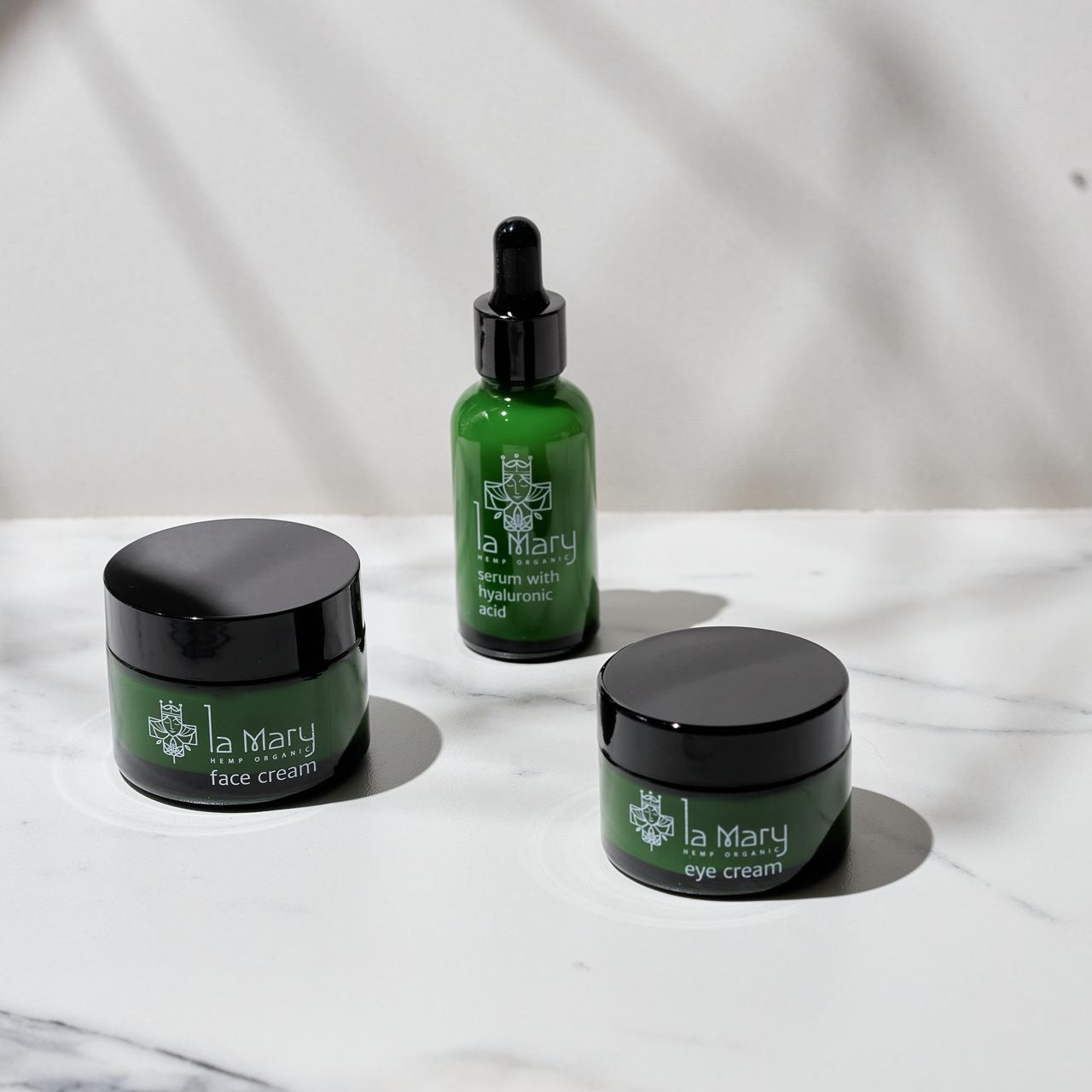 Набор CBD косметики La Mary hemp organic - инновационная косметика для Вас.Крем содержит уникальный компонент - каннабидиол (CBD) - активный компонент конопли.Каннабидиол обладает противовоспалительным и противомикробным действием, помогая эффективно бороться с акне, угревой сыпью, герпесом, гиперпигментацией, а также такими кожными заболеваниями как псориаз, экзема и дерматит; регенерирующим - помогает коже восстановиться после повреждений; антиоксидантным - стимулирует выработку коллагена и эластина, способствуя упругости и подтянутости кожи, улучшая ее вид и цвет; увлажняющим - способствует устранению сухости и шелушения; успокаивающим - помогает устранить воспаления и раздражения.Крем помогает поддерживать липидный баланс, стимулировать обмен веществ в клетках, обеспечивать высокую иммунную защиту, устранять раздражение. Комплекс полезных масел обеспечивает надежную антиоксидантную защиту, смягчает, питает. la Mary/ Крем для лица с конопляным маслом и каннабидиолом, 50мл — Крем для лица с конопляным маслом и каннабидиолом, 50мл la Mary/ Крем для век с конопляным маслом и каннабидиолом, 30мл —/ Крем для век с конопляным маслом и каннабидиолом, 30мл la Mary/ Сыворотка для лица с гиалуроновой кислотой, конопляным маслом и каннабидиолом(CBD), 30мл Сыворотку для лица с гиалуроновой кислотой, конопляным маслом и каннабидиолом(CBD), 30мл
